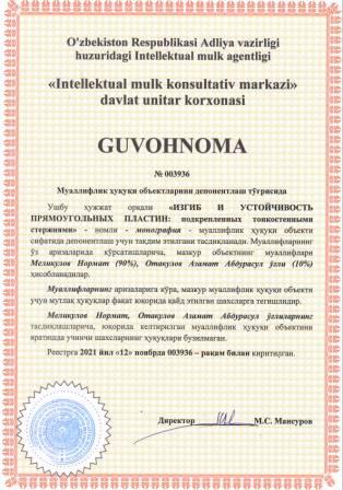 | 6156 | №003936 | Монография - "ИЗГИБ И УСТОЙЧИВОСТЬ ПРЯМОУГОЛЬНЫХ ПЛАСТИН: подкрепленных тонкостенными стержнями" | Меликулов Нормат (90%), Отакулов Азамат Абдурасул ўғли (10%) | Меликулов Нормат, Отакулов Азамат Абдурасул ўғли | 11/12/2021 | ![]() |