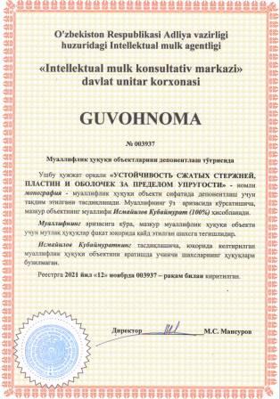 | 6155 | №003937 | Монография - "УСТОЙЧИВОСТЬ СЖАТЫХ СТЕРЖНЕЙ, ПЛАСТИН И ОБОЛОЧЕК ЗА ПРЕДЕЛОМ УПРУГОСТИ" | Исмайилов Кубаймурат (100%) | Исмайилов Кубаймурат | 11/12/2021 | ![]() |