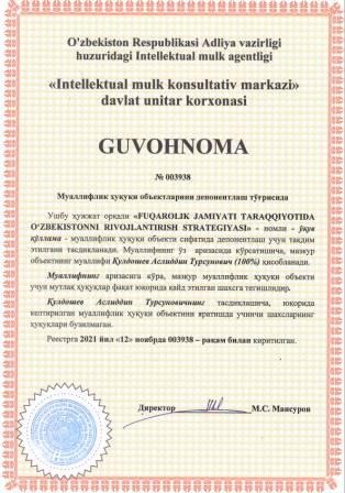 | 6154 | №003938 | Ўқув қўлланма - "FUQAROLIK JAMIYATI TARAQQIYOTIDA O‘ZBEKISTONNI RIVOJLANTIRISH STRATEGIYASI" | Қулдошев Аслиддин Турсунович (100%) | Қулдошев Аслиддин Турсунович | 11/12/2021 | ![]() |