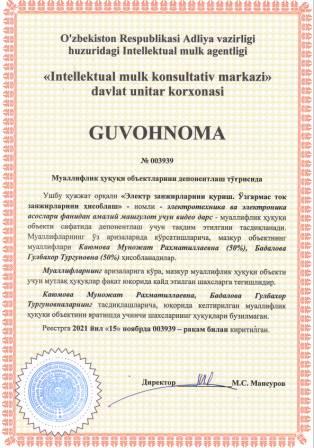 | 6153 | №003939 | Электротехника ва электроника асослари фанидан амалий машғулот учун видео дарс-"Электр занжирларини қуриш. Ўзгармас ток занжирларини ҳисоблаш" | Каюмова Муножат Рахматиллаевна (50%), Бадалова Гулбахор Тургуновна (50%) | Каюмова Муножат Рахматиллаевна, Бадалова Гулбахор Тургуновна | 11/15/2021 | ![]() |