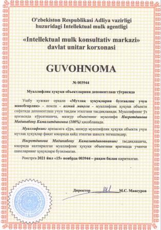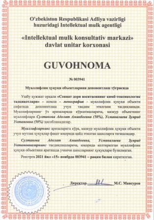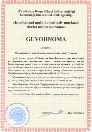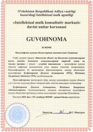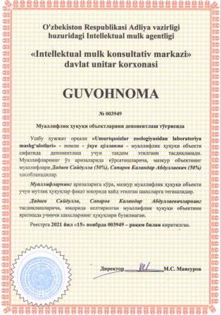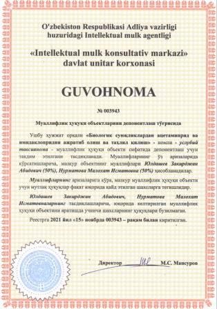 | 6150 | №003942 | Услубий тавсиянома - "Имидаклоприд ва ацетамипридни биологик объектдан ажратиб олиш ва таҳлил қилиш" | Юлдашев Закирджан Абидович (50%), Нурматова Малохат Исматовна (50%) | Юлдашев Закирджан Абидович, Нурматова Малохат Исматовна | 11/15/2021 | ![]() |
