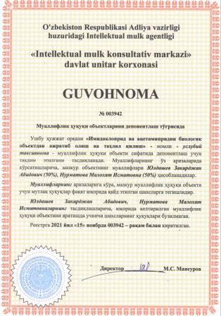 | 6149 | №003943 | Услубий тавсиянома - "Биологик суюқликлардан ацетамиприд ва имидаклопридни ажратиб олиш ва таҳлил қилиш" | Юлдашев Закирджан Абидович (50%), Нурматова Малохат Исматовна (50%) | Юлдашев Закирджан Абидович, Нурматова Малохат Исматовна | 11/15/2021 | ![]() |