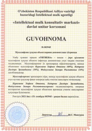 | 6147 | №003945 | Ўқув қўлланма - "ГИГИЕНА" | Нуралиева Хафиза Отаевна (60%), Кадирова Дилдора Эргашбаевна (30%), Файзуллаева Замира Рахматовна (10%) | Нуралиева Хафиза Отаевна, Кадирова Дилдора Эргашбаевна, Файзуллаева Замира Рахматовна | 11/15/2021 | ![]() |