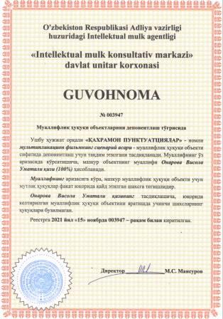 | 6145 | №003947 | Мультипликацион фильмнинг сценарий асари - "ҚАХРАМОН ПУНКТУАТЦИЯЛАР" | Онарова Висола Уматали қизи (100%) | Онарова Висола Уматали қизи | 11/15/2021 | ![]() |