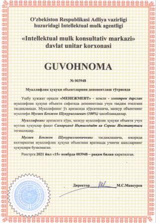 | 6144 | №003948 | Электрон дарслик - "МЕНЕЖМЕНТ" | Мусаев Бекжон Шукуриллаевич (100%) | Самарқанд Иқтисодиёт ва Сервис Институти | 11/15/2021 | ![]() |