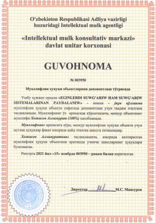| 6142 | №003950 | Ўқув қўлланма - "EGINLERDI SUWG'ARIW HAM SUWG'ARIW SISTEMALARINAN PAYDALANIW" | Хожасов Алламурат (100%) | Хожасов Алламурат | 11/15/2021 | ![]() |