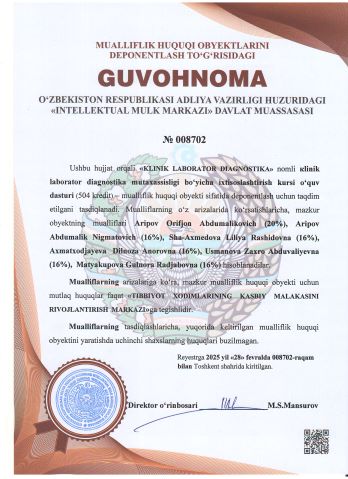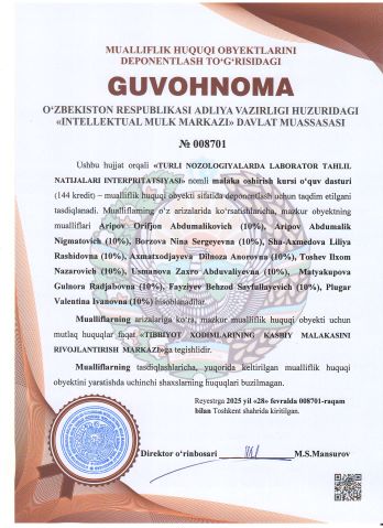 620 | №008701 | Malaka oshirish kursi o‘quv dasturi (144 kredit) - "TURLI NOZOLOGIYALARDA LABORATOR TAHLIL NATIJALARI INTERPRITATSIYASI" | Aripov Orifjon Abdumalikovich (10%), Aripov Abdumalik Nigmatovich (10%), Borzova Nina Sergeyevna (10%), Sha-Axmedova Liliya Rashidovna (10%), Axmatxodjayeva Dilnoza Anorovna (10%), Toshev Ilxom Nazarovich (10%), Usmanova Zaxro Abduvaliyevna (10%), Matyakupova Gulnora Radjabovna (10%), Fayziyev Behzod Sayfullayevich (10%), Plugar Valentina Ivanovna (10%) | TIBBIYOT XODIMLARINING KASBIY MALAKASINI RIVOJLANTIRISH MARKAZI | 02/28/2025 | ![]() |