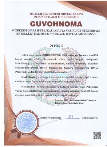 612 | №008710 | O‘quv qo‘llanma - "ЭНЗИМОЛОГИЯ" | Mirxamidova Parida (40%), Shaxmurova Gulnara Abdullayevna (30%), Pokrovskiy Vadim Sergyevich (30%) | Mirxamidova Parida, Shaxmurova Gulnara Abdullayevna, Pokrovskiy Vadim Sergyevich | 03/05/2025 | ![]() |