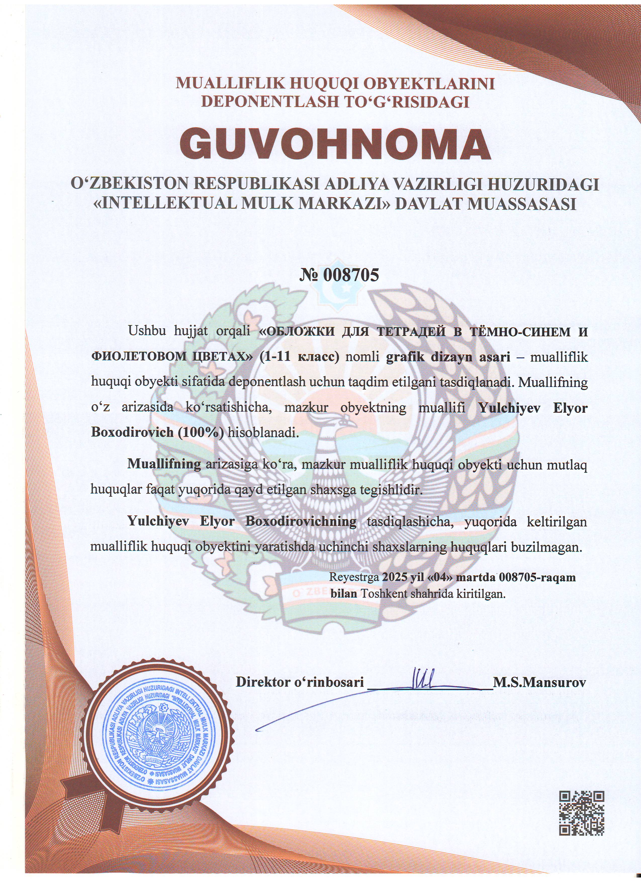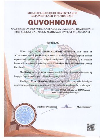 613 | №008709 | Grafik dizayn asari - "УНИВЕРСАЛЬНЫЕ ОБЛОЖКИ ДЛЯ КНИГ И ЖУРНАЛОВ" (1-11 класс) | Yulchiyev Elyor Boxodirovich (100%) | Yulchiyev Elyor Boxodirovich | 03/04/2025 | ![]() |