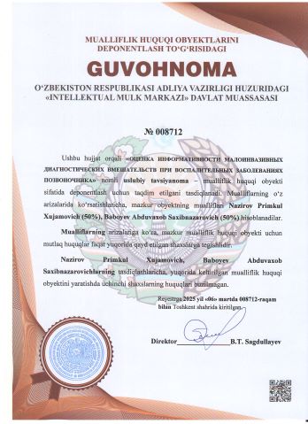 610 | №008712 | Uslubiy tavsiyanoma - "ОЦЕНКА ИНФОРМАТИВНОСТИ МАЛОИНВАЗИВНЫХ ДИАГНОСТИЧЕСКИХ ВМЕШАТЕЛЬСТВ ПРИ ВОСПАЛИТЕЛЬНЫХ ЗАБОЛЕВАНИЯХ ПОЗВОНОЧНИКА" | Nazirov Primkul Xujamovich (50%), Baboyev Abduvaxob Saxibnazarovich (50%) | Nazirov Primkul Xujamovich, Baboyev Abduvaxob Saxibnazarovich | 03/06/2025 | ![]() |