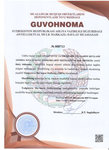 609 | №008713 | Ilmiy ishlanma - "NOAN’ANVIY TAʼSIR QILISH USULLARINI QOʻLLASH ASOSIDA IGNA BARGLI OʻSIMLIKLARNI EKSTRAKSIYALASH OBYEKTI" | Yodgorova Ma’mura Orifovna (100%) | Yodgorova Ma’mura Orifovna | 03/06/2025 | ![]() |
