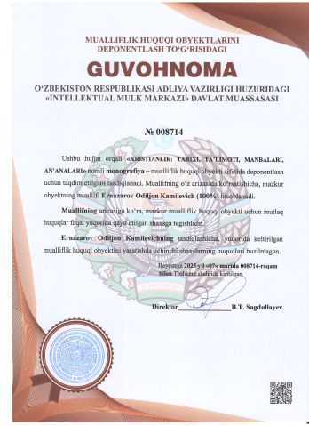 608 | №008714 | Monografiya - "XRISTIANLIK: TARIXI, TA’LIMOTI, MANBALARI, AN’ANALARI" | Ernazarov Odiljon Kamilevich (100%) | Ernazarov Odiljon Kamilevich | 03/07/2025 | ![]() |