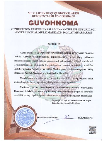 604 | №008718 | Ilmiy ishlanma - "МАТЕМАТИЧЕСКАЯ МОДЕЛЬ ПРОГНОЗИРОВАНИЯ РИСКА СТОМАТОЛОГИЧЕСКИХ ЗАБОЛЕВАНИЙ" | Xabibova Nazira Nasulloyevna (30%), Masharipova Nasiba Ataboyevna (30%), Rozzoqov Azizbek Narimon o‘g‘li (40%) | Xabibova Nazira Nasulloyevna, Masharipova Nasiba Ataboyevna, Rozzoqov Azizbek Narimon o‘g‘li | 03/11/2025 | ![]() |