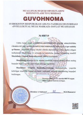 603 | №008719 | O‘quv-uslubiy qo‘llanma - "OTORINOLARINGOLOGIYA KLINIK AMALIYOTIDA CHAKKA SUYAKLARNING KOMPYUTER TOMOGRAFIYASI" | Muxitdinov Ulugbek Bashrullayevich (100%) | Muxitdinov Ulugbek Bashrullayevich | 03/11/2025 | ![]() |