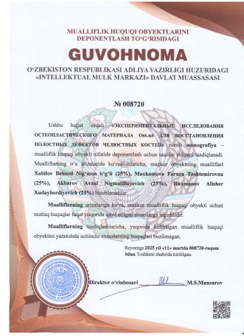 602 | №008720 | Monografiya - "ЭКСПЕРИМЕНТАЛЬНЫЕ ИССЛЕДОВАНИЯ ОСТЕОПЛАСТИЧЕСКОГО МАТЕРИАЛА Оss.uz ДЛЯ ВОССТАНОВЛЕНИЯ ПОЛОСТНЫХ ДЕФЕКТОВ ЧЕЛЮСТНЫХ КОСТЕЙ" | Xabilov Behzod Nig‘mon o‘g‘li (25%), Maxkamova Feruza Tashtemirovna (25%), Akbarov Avzal Nigmatillayevich (25%), Raxmanov Alisher Xudayberdiyevich (25%) | Xabilov Behzod Nig‘mon o‘g‘li, Maxkamova Feruza Tashtemirovna, Akbarov Avzal Nigmatillayevich, Raxmanov Alisher Xudayberdiyevich | 03/11/2025 | ![]() |