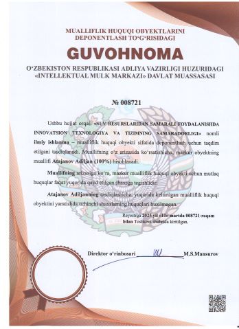 601 | №008721 | Ilmiy ishlanma - "SUV RESURSLARIDAN SAMARALI FOYDALANISHDA INNOVATSION TEXNOLOGIYA VA TIZIMNING SAMARADORLIGI" | Atajanov Adiljan (100%) | Atajanov Adiljan | 03/11/2025 | ![]() |