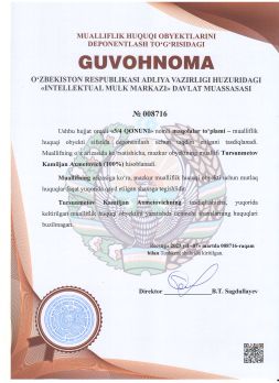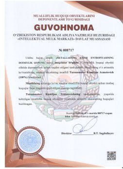 605 | №008717 | Maqolalar to‘plami – "METALLARNING ERISH ENTROPIYASINING DOIMIYLIK QONUNI" | Tursunmetov Kamiljan Axmetovich (100%) | Tursunmetov Kamiljan Axmetovich | 03/07/2025 | ![]() |