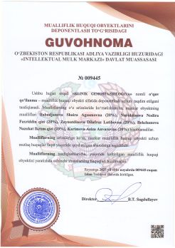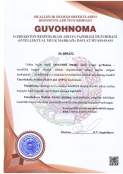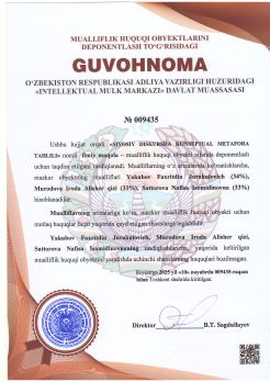 | 675 | №009437 | Elektron darslik – "FALSAFA" | Qaxorov Pulotjon Xursanmurodovich (30%), Azimov Ozod Mamatkulovich (35%), Usmonov Salohiddin Dushan o‘g‘li (35%) | Qaxorov Pulotjon Xursanmurodovich, Azimov Ozod Mamatkulovich, Usmonov Salohiddin Dushan o‘g‘li | 11/10/2025 | ![]() |