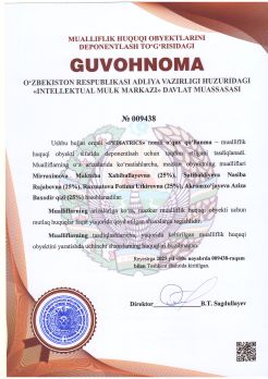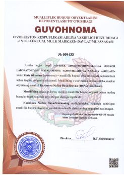 | 672 | №009440 | o‘quv qo‘llanma –"УЧЕБНОЕ ПОСОБИЕ ДЛЯ ПРОФЕССИОНАЛЬНОЙ ГИГИЕНИЧЕСКОЙ ПОДГОТОВКИ ДОЛЖНОСТНЫХ ЛИЦ И РАБОТНИКОВ ПРЕДПРИЯТИЙ ПО ПРОИЗВОДСТВУ ПИТЬЕВОГО МОЛОКА И МОЛОЧНЫХ ПРОДУКТОВ" | Kamilova Roza Tolanovna (34%), Ataniyazova Raushan Aminovna (33%), Isakova Lola Isakovna (33%) | Kamilova Roza Tolanovna, Ataniyazova Raushan Aminovna, Isakova Lola Isakovna ) | 11/11/2025 | ![]() |