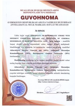 | 676 | №009436 | Ilmiy maqola – "SPECIFICITY OF HEMORRHAGIC STROKE WITH DIFFERENT UNDERLYING DISEASES AND PREDICTION OF CEREBRAL HEMORRHAGE IN DIABETES MELLITUS" | Akbaraliyeva Sayyora Umarjon qizi (40%), Ataniyazov Maxsudjan Kamaladdinovich (30%), Raximbayeva Gulnora Sattarovna (30%) | Akbaraliyeva Sayyora Umarjon qizi, Ataniyazov Maxsudjan Kamaladdinovich, Raximbayeva Gulnora Sattarovna | 11/10/2025 | ![]() |