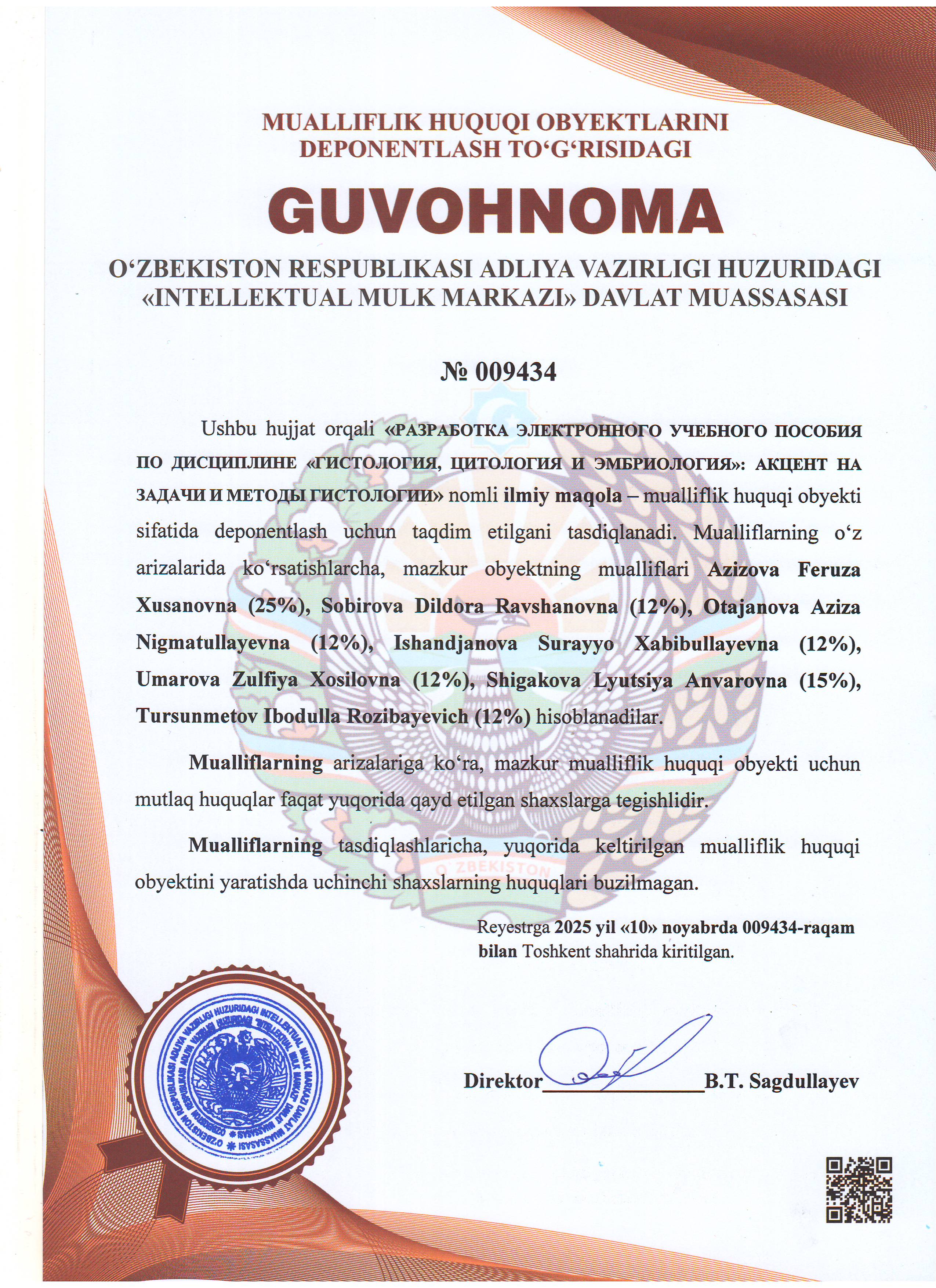 | 678 | №009434 | Ilmiy maqola – "РАЗРАБОТКА ЭЛЕКТРОННОГО УЧЕБНОГО ПОСОБИЯ ПО ДИСЦИПЛИНЕ «ГИСТОЛОГИЯ, ЦИТОЛОГИЯ И ЭМБРИОЛОГИЯ»: АКЦЕНТ НА ЗАДАЧИ И МЕТОДЫ ГИСТОЛОГИИ" | Azizova Feruza Xusanovna (25%), Sobirova Dildora Ravshanovna (12%), Otajanova Aziza Nigmatullayevna (12%), Ishandjanova Surayyo Xabibullayevna (12%), Umarova Zulfiya Xosilovna (12%), Shigakova Lyutsiya Anvarovna (15%), Tursunmetov Ibodulla Rozibayevich (12%) | Azizova Feruza Xusanovna, Sobirova Dildora Ravshanovna, Otajanova Aziza Nigmatullayevna, Ishandjanova Surayyo Xabibullayevna, Umarova Zulfiya Xosilovna, Shigakova Lyutsiya Anvarovna, Tursunmetov Ibodulla Rozibayevich | 11/10/2025 | ![]() |