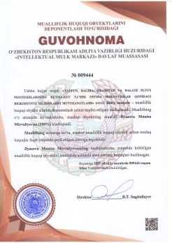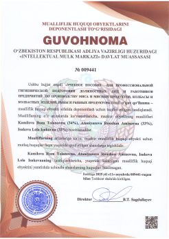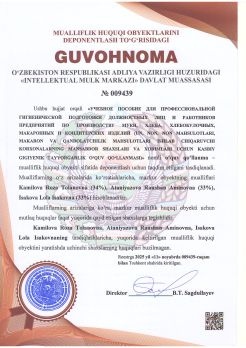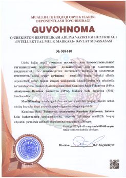 | 673 | №009439 | O‘quv qo‘llanma – "«УЧЕБНОЕ ПОСОБИЕ ДЛЯ ПРОФЕССИОНАЛЬНОЙ ГИГИЕНИЧЕСКОЙ ПОДГОТОВКИ ДОЛЖНОСТНЫХ ЛИЦ И РАБОТНИКОВ ПРЕДПРИЯТИЙ ПО ПРОИЗВОДСТВУ МУКИ, ХЛЕБА, ХЛЕБОБУЛОЧНЫХ, МАКАРОННЫХ И КОНДИТЕРСКИХ ИЗДЕЛИЙ» (UN, NON, NON MAHSULOTLARI, MAKARON VA QANDOLATCHILIK MAHSULOTLARI ISHLAB CHIQARUVCHI KORXONALARNING MANSABDOR SHAXSLARI VA XODIMLARI UCHUN KASBIY GIGIYENIK TAYYORGARLIK O‘QUV QO‘LLANMASI) " | Kamilova Roza Tolanovna (34%), Ataniyazova Raushan Aminovna (33%), Isakova Lola Isakovna (33%) | Kamilova Roza Tolanovna, Ataniyazova Raushan Aminovna, Isakova Lola Isakovna | 11/11/2025 | ![]() |