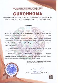 | 669 | №009443 | Uslubiy tavsiyanoma – "МЕТОДИКА ВЕДЕНИЯ ПАЦИЕНТОВ С НЕВРОТИЧЕСКИМИ РАССТРОЙСТВАМИ ПОСЛЕ ПЕРЕНЕСЕННОГО COVID-19 В УСЛОВИЯХ ПЕРВИЧНОГО ЗВЕНА" | Kevorkova Marina Anatolevna (80%) Magzumova Shaxnoza Shaxzadeyevna (20%) | Kevorkova Marina Anatolevna, Magzumova Shaxnoza Shaxzadeyevna | 11/11/2025 | ![]() |
