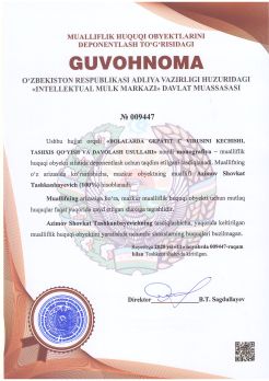 | 664 | №009448 | ALISHER NAVOIY «XAMSA»SINING TO‘RTINCHI DOSTONI «BAXROM VA DILOROM» MUSIQIY XOREOGRAFIK SPEKTAKLI KOMPOZITSION REJASI VA LIBRETTO | Atakhanov Shavkat Djurabayevich (100%) | Atakhanov Shavkat Djurabayevich | 11/11/2025 | ![]() |