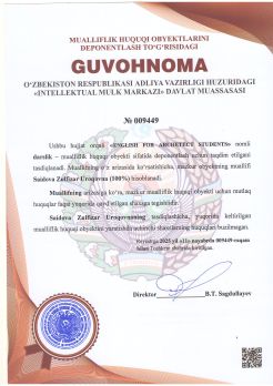 | 663 | №009449 | Darslik – "ENGLISH FOR ARCHETECT STUDENTS" | Saidova Zulfizar Uroqovna (100%) | Saidova Zulfizar Uroqovna | 11/11/2025 | ![]() |