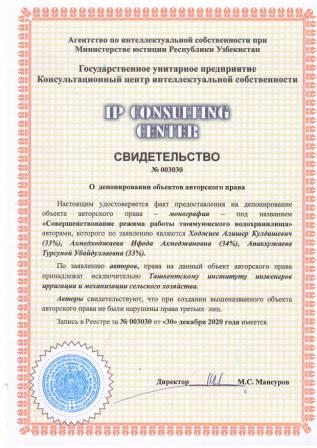 | 7144 | №003044 | Монография - "Органик чиқиндиларга поғонали ишлов бериш" | Имомов Шавкат Жахонович (50%), Султонов Мансур Қиличович (50%) | Тошкент ирригация ва қишлоқ ҳўжалигини механизациялаш мухандислари институти | 12/30/2020 | ![]() |