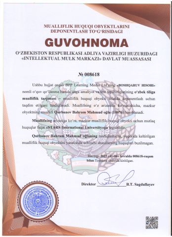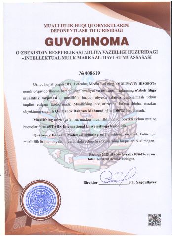 720 | №008618 | O‘zbek tiliga mualliflik tarjimasi – "BOSHQARUV HISOBI" | Qurbanov Bahram Mahmud oğlu (100%) | STARS International University | 02/06/2025 | ![]() |
