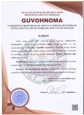 718 | №008620 | O‘zbek tiliga mualliflik tarjimasi – "MOLIYAVIY MENEJMENT" | Qurbanov Bahram Mahmud oğlu (100%) | STARS International University | 02/06/2025 | ![]() |
