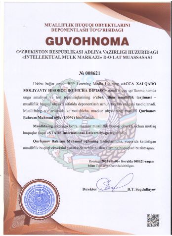 717 | №008621 | O‘zbek tiliga mualliflik tarjimasi – "ACCA XALQARO MOLIYAVIY HISOBOT BO‘YICHA DIPLOM" | Qurbanov Bahram Mahmud oğlu (100%) | STARS International University | 02/06/2025 | ![]() |