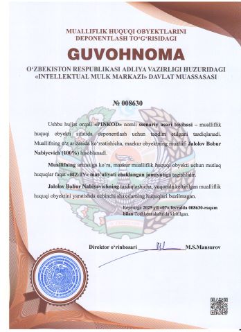 708 | №008630 | Ssenariy asari loyihasi - "PINKOD" | Jalolov Bobur Nabiyevich (100%) | «BIZ-TV» mas’uliyati cheklangan jamiyati | 02/07/2025 | ![]() |