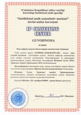 | 7319 | №002869 | Ўқув-услубий қўлланма - "TUPROQ GEOGRAFIYASI" | Юлдашев Гулом (50%), Турдалиев Авазбек Турдалиевич (50%) | Фарғона давлат университети | 12/25/2020 | ![]() |