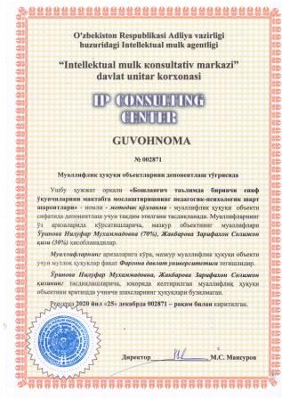 | 7317 | №002871 | Методик қўлланма - "Бошланғич таълимда биринчи синф ўқувчиларини мактабга мослаштиришнинг педагогик-психологик шарт шароитлари" | Ўринова Нилуфар Мухаммадовна (70%), Жакбарова Зарифахон Солижон қизи (30%) | Фарғона давлат университети | 12/25/2020 | ![]() |