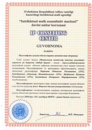 | 7301 | №002887 | Ўқув-услубий қўлланма - "Кимёвий технология фанидан лаборатория машғулотларини ўтказиш" | Нишонов Миркозимжон (60%), Юнусов Мирзохид Мирзакаримович (40%) | Фарғона давлат университети | 12/25/2020 | ![]() |