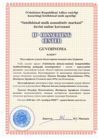 | 7311 | №002877 | Ўқув-услубий қўлланма - "Talabalarda ijtimoiy-madaniy kompetentlikni shakllantirishning pedagogik texnologiyalari" | Ўринова Нилуфар Мухаммадовна (70%), Жакбарова Зарифахон Солижон қизи (30%) | Фарғона давлат университети | 12/25/2020 | ![]() |