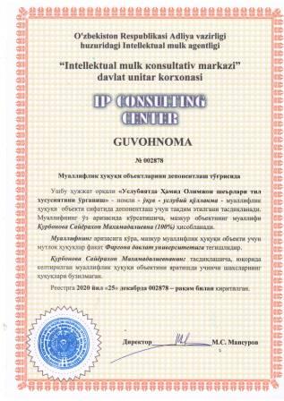 | 7310 | №002878 | Ўқув-услубий қўлланма - "Услубиятда Ҳамид Олимжон шеърлари тил хусусиятини ўрганиш" | Қурбонова Сайёрахон Махамадалиевна (100%) | Фарғона давлат университети | 12/25/2020 | ![]() |