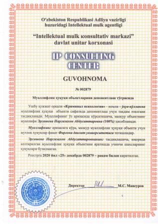 | 7309 | №002879 | Ўқув қўлланма - "Криминал психология" | Эргашева Наргизахон Абдусаттаровна (100%) | Фарғона давлат университети | 12/25/2020 | ![]() |