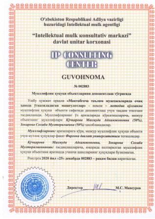 | 7318 | №002870 | Услубий кўрсатма - "Ta‘limda axborot texnologiyalari fani bo‘yicha laboratoriya ishlarini bajarish" | Мирзаакбаров Дилшод Довлатбоевич (50%), Тожиев Тохиржон Халимович (25%), Тошболтаев Фахриддин Ўринбоевич (25%) | Фарғона давлат университети | 12/25/2020 | ![]() |