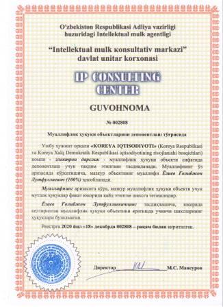 | 7380 | №002808 | Электрон дарслик - "KOREYA IQTISODIYOTI" (Koreya Respublikasi va Koreya Xalq Demokratik Respublikasi iqtisodiyotining rivojlanishi bosqichlari) | Ёзиев Ғолибжон Лутфуллаевич (100%) | Ёзиев Ғолибжон Лутфуллаевич | 12/18/2020 | ![]() |