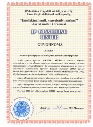 | 7378 | №002810 | Дарслик - "ICHKI AUDIT" | Туйчиев Алишер Жураевич (50%), Қўзиев Исломжон Неъматович (20%), Хайдаров Равшан Мирзакаланович (10%), Яқубов Матрасул Мавлонбердиевич (20%) | Туйчиев Алишер Жураевич, Қўзиев Исломжон Неъматович, Хайдаров Равшан Мирзакаланович, Яқубов Матрасул Мавлонбердиевич | 12/18/2020 | ![]() |