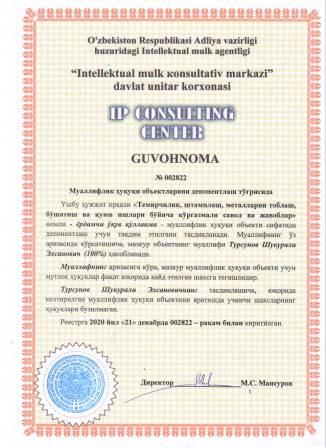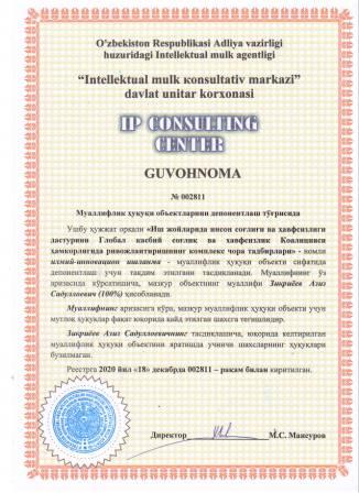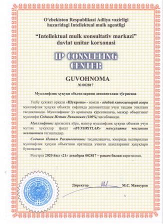| 7371 | №002817 | Адабий киносценарий асари - "Шукрона" | Содиков Истам Рахимович (100%) | "BUXORIYLAR" маъсулияти чекланган жамияти | 12/21/2020 | ![]() |