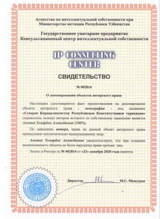 | 7374 | №002814 | Монография - "Суверен Қорақалпоғистон Республикаси Конститутцияси тарихидан" (қорақалпоқ тилида) | Аметов Темирбек Алмасбаевич (100%) | Аметов Темирбек Алмасбаевич | 12/21/2020 | ![]() |