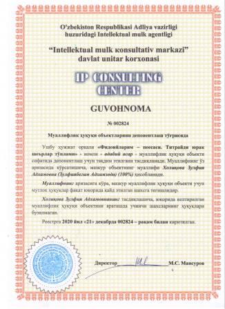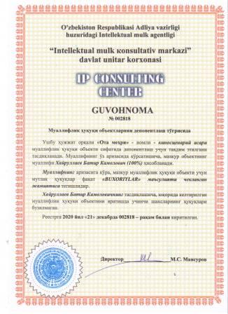 | 7370 | №002818 | Киносценарий асари - "Ота меҳри" | Хайруллаев Батир Камолович (100%) | "BUXORIYLAR" маъсулияти чекланган жамияти | 12/21/2020 | ![]() |