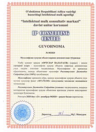 | 7368 | №002820 | Сценарий асари – "ОРЗУЛАР ПАЛАТАСИ" (сериал) | Рахматуллаев Дастонбек Садриддин ўғли (100%) | "MY-FILMS" маъсулияти чекланган жамияти | 12/21/2020 | ![]() |