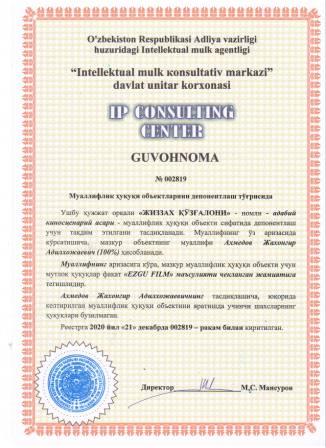 | 7369 | №002819 | Адабий киносценарий асари - "ЖИЗЗАХ ҚЎЗҒАЛОНИ" | Ахмедов Жахонгир Адилхожаевич (100%) | "EZGU FILM" маъсулияти чекланган жамияти | 12/21/2020 | ![]() |