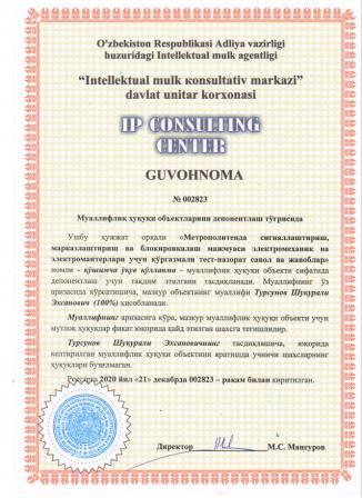 | 7365 | №002823 | Ўқув қўлланма - "Метрополитенда сигналлаштириш, марказлаштириш ва блокировкалаш мажмуаси электромеханик ва электромантерлари учун кўргазмали тест-назорат савол ва жавоблар" | Турсунов Шукурали Эхсанович (100%) | Турсунов Шукурали Эхсанович | 12/21/2020 | ![]() |