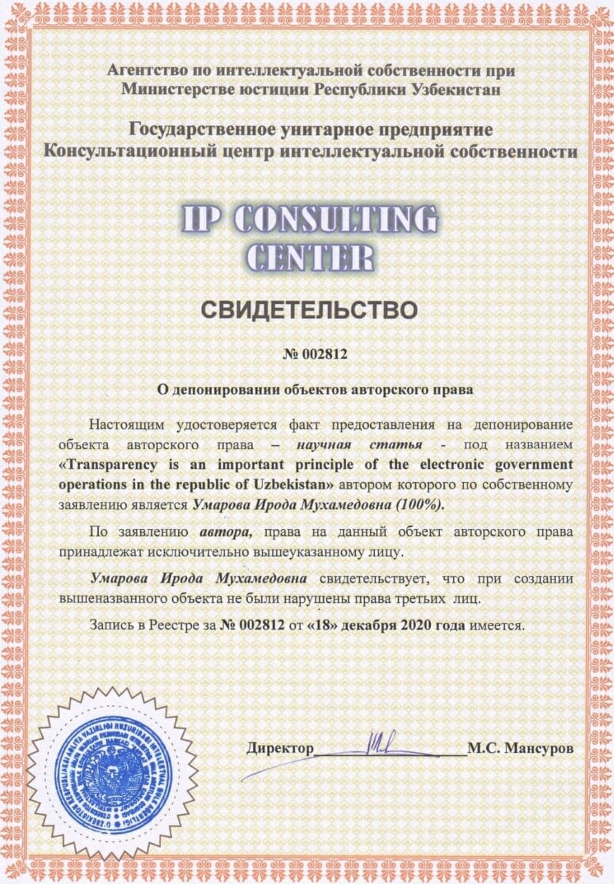 | 7376 | №002812 | Научная статья – "Transparency is an important principle of the electronic government operations in the republic of Uzbekistan" | Умарова Ирода Мухамедовна (100%) | Умарова Ирода Мухамедовна | 12/18/2020 | ![]() |